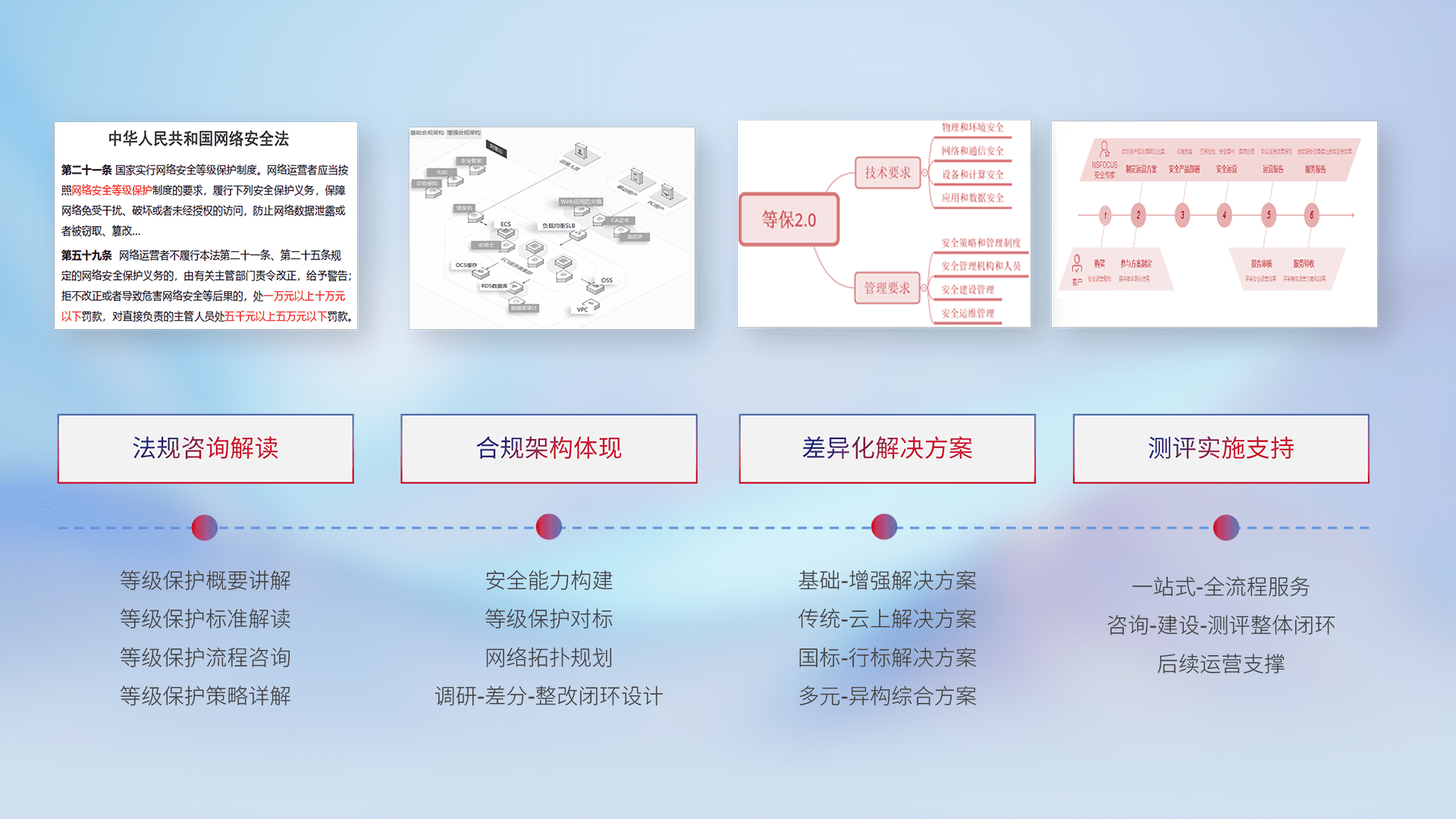 通过专业的法律咨询解读、、合规架构体现、、、差异化解决方案、、、测试实施支持等服务,,为客户量身打造等保合规体系。。。。